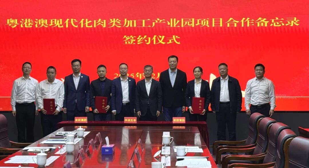 2025年12月18日下午,珠海农控集团旗下广东省珠海粮油食品进出口有限公司(以下简称“食出公司”)与华润五丰(中国)投资有限公司(以下简称“华润五丰”)、珠海金航产业投资集团有限公司(以下简称“金航集团”)在珠海市金湾区市民服务中心共同签署《粤港澳现代化肉类加工产业园项目合作备忘录》,标志着三方将强强联合,携手打造一个深耕珠海、服务港澳、辐射珠西、面向全国的高标准现代化肉类供应新平台。金湾区委书记梁耀斌,华润五丰副总经理许宗煜,珠海农控集团党委书记、董事长李鸿斌等出席签约仪式,金湾区政协副主席黎文星主持签约仪式。